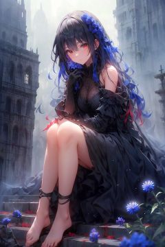 leaning against the ruins, with a floating skeleton in the background,her posture is seductive, and there is a flicker of evil energy runes in the background, blood mist filled, and soft light. No shoes,My feet are covered in bones. Skeletons, many skeletons. Official art, unit 8 k wallpaper, ultra detailed, beautiful and aesthetic, masterpiece, best quality, extremely detailed, dynamic angle, paper skin, radius, iuminosity, cowboyshot, the most beautiful form of Chaos, elegant, a brutalist designed, visual colors, romanticism, by James Jean, roby dwi antono, cross tran, francis bacon, Michael mraz, Adrian ghenie, Petra cortright, Gerhard richter, Takato yamamoto, ashley wood, atmospheric, ((late at night,dark)), light rain,dark, limited palette, contrast,(((Cornflower))), cornflower, cornflower,vines, forest, lens flare, hdr, Tyndall effect,damp,wet,cold theme, broken wall, aqua theme, floating hair, high detail, nayutaren, Nyarly,Sitting in the Flower Sea