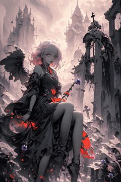 leaning against the ruins, with a floating skeleton in the background,her posture is seductive,and there is a flicker of evil energy runes in the background, blood mist filled, and soft light. No shoes,My feet are covered in bones. Skeletons, many skeletons. Official art, unit 8 k wallpaper, ultra detailed, beautiful and aesthetic, masterpiece, best quality, extremely detailed, dynamic angle, paper skin, radius, iuminosity, cowboyshot, the most beautiful form of Chaos, elegant, a brutalist designed, visual colors, romanticism, by James Jean, roby dwi antono, cross tran, francis bacon, Michael mraz, Adrian ghenie, Petra cortright, Gerhard richter, Takato yamamoto, ashley wood, atmospheric, ((late at night,dark)), light rain,dark, limited palette, contrast,(((Cornflower))), corn