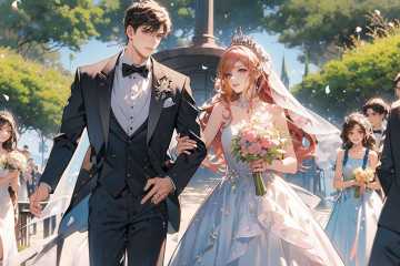 (masterpiece:1.2),(masterpiece, top quality, best quality),highres,original,dynamic pose,1girl, 1boy, dress, veil, wedding dress, black hair, bow, long hair, hetero, tiara, jewelry, black pants, bowtie, formal, white dress, pants, ring, standing, wedding, outdoors, suit, tuxedo, couple, looking at another, bridal veil, bride, day, vest, black bowtie, black bow, groom, novel cover, pink hair, flower, brown eyes)<lora:hunli:0.6>
