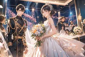 (masterpiece:1.2),(masterpiece, top quality, best quality),highres,original,dynamic pose,1 girl, 1 boy, flowers, black hair, evening gown, dress, military uniform, military uniform, bouquet, long hair, hair accessories, earrings, military uniform, shirt, holding bouquet, white flower, holding, straight, white shirt, pink flower, looking at the audience, short hair<lora:hunli:0.5>