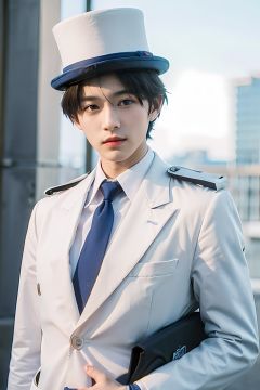 (Masterpiece: 1.8) ,1boy, gloves, male focus, hat, white gloves, solo, red necktie, formal, black hair, suit, blue eyes, anatomically correct, high details, best quality, HD