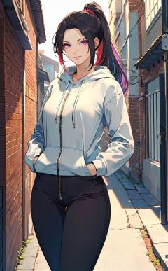 (masterpiece),(best quality),highres,incredibly absurdres,absurdres,very_high resolution,original,intricate details,hyper detail,ultra-detailed,exquisite detailed,extremely delicate,illustration,chromatic aberration,film grain,cinematic,bokeh,caustics,emphasis lines,extremely detailed CG,unity 8k wallpaper,flat color,sketch,(1girl),shiny hair,glossy hair,sharp_eyelid,eyeliner,eyelashes,eyeshadow,tall female,mature female,*******,perfect detailed face,lips,(lipgloss),feminine proportions,skinny,toned,slim,wide hips,curvy,large_breasts,perky_breasts,shiny skin,glossy skin,(long legs),cropped legs,cowboy shot,knee,(detailed beautiful scene),scenery,landscape,bloom,picturesque,UHD wallpaper,HDR,global illumination,volumetric light,wavy hair,forehead,parted bangs,black hair,multicolored hair,gradient hair,red hair,hair behind ear,low ponytail,ponytail,purple eyes,smile,light smile,(black_pants),(grey_hoodie),long sleeves,(zipper),sunlight,nature,street,window,plant,brick wall,(vines),(alley),depth of field,(hands in pockets),<lora:mashu style-03:0.8>, mashu_style,