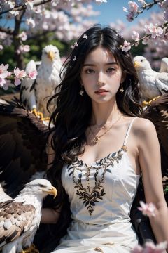 1 girl (surrounded by eagles), necklace, black hair, dress, sitting, black long hair, flowers, branches, solo, long hair, embroidered dress, brown hair, bare shoulders, various eagles, foreground blocking, depth of field, watching the audience, dynamic posture, realistic, cherry blossoms, feathers