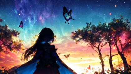 (silhouette:1.3),  1girl with lightblue long hair,  hair flowers,  with butterfly,  cape,  in the garden,  at night,  light particles,  firefly,  hime cut,  (aurora:0.6),   ,  starry,  strry light,  night, ,  starry, <lora:EMS-668-EMS:0.300000>