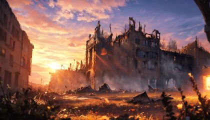 (blurry, depth of field, blurry foreground:1.3),(Super wide Angle lens:1.25),(extremely detailed background),no human,BREAK,To the right was a (black land after the fire:1.2),(gray and black land),(diffuse gray smoke),(dark cloud),(desolate and dead ruin in the distance),((sunset))