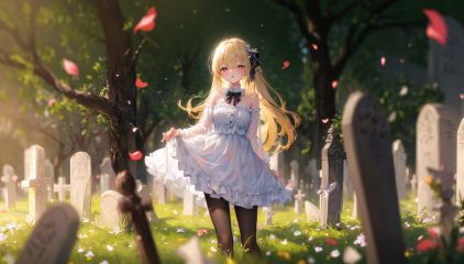 (blurry, depth of field, blurry foreground:1.3),1girl,graveyard,solo,long hair,red eyes,tree,blonde hair,cross,tombstone,pantyhose,petals,hair over one eye,dress,ghost,black pantyhose,(holding)