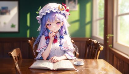 The scenery outside the window,(blurry, depth of field, perspective,blurry foreground:1.35),1girl,patchouli knowledge,solo,purple hair,long hair,cup,hat,crescent,teacup,purple eyes,book,sitting,hat ornament,crescent hat ornament,ribbon,reading,capelet,The scenery outside the window,bow,chair,tea,anime coloring,hair bow,tress ribbon,