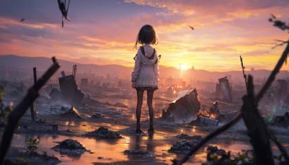 (blurry, depth of field, blurry foreground:1.3),(Super wide Angle lens:1.25),(extremely detailed background),BREAK,To the right was a (black land after the fire:1.2),(gray and black land),(diffuse gray smoke),(dark cloud),(desolate and dead ruin in the distance),((sunset)),(((1girl,loli))),full body,from behind,standing