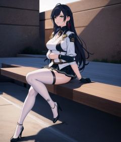 1girl, solo, long hair, gloves, skirt, earrings, green eyes, jewelry, black gloves, black hair, half gloves,cowboy shot, miniskirt, pleated skirt, ribbon, outdoors,linyeXF,