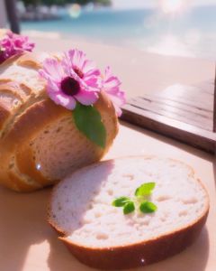 yanzhi, Cinematic scene, (lens flare:1.3), still-life photography, Rich cuisine, bread, beverages, wine, pink flowers, ocean, Depth field, film grain, bokeh, best quality, masterpiece, high resolution, no humans,