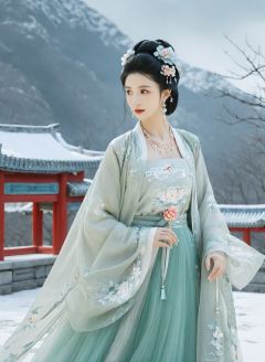 masterpiece,best quality,8K,official art,ultra high res,1girl,looking at viewer,chinese clothes,hanfu,jewelry,hair ornament,upper body,solo,earrings,snowy mountain,ruins,flower,black hair,necklace,teeth,hair bun,dress,parted lips,hair flower,((full body)),dress,hanfu,embroidery,exquisite,meticulous,(tulle:1.4),