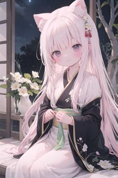 Branches, night, trees, long hair, lap animals, jade shell, sit, round Windows, flowers, smiles, hair accessories, jewelry, in the tree, night sky, earrings, Chinese clothes, spring (season), pink flowers, Hanfu, sky, fortune (fate), very long hair, cat ears, sitting in the tree, hair flowers, stroke, blush, naked tree, wide sleeves, long sleeves
