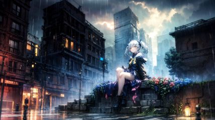 1girl,white hair,twin tails, yellow eyes,(depth of field),(sitting),(many colorful flowers),(full body,mid shot),panorama,cage,rainy,dark cloud,