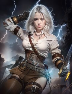 1girl,(weapon:1),(sword:1),scar,gloves,solo,breasts,(scar on face:1),shirt,belt,corset,leather,white shirt,white hair,pants,brown gloves,holding,lips,short hair,scar across eye,holding weapon,medium breasts,leather pants,holding sword,(detailed light),((lightning in hand)),lightning surrounds,(((lightning chain))),, (photorealistic:1.3),(masterpiece:1.2),(best quality:1.2),HDR,UHD,8K,Highly detailed,ultra-fine painting,sharp focus,physically-based rendering,extreme detail description,Professional,Vivid Colors,studio soft light,