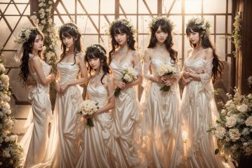 multiple girls,flower,black hair,long hair,dress,breasts,short hair,brown hair,white hair,black hair,blonde,6+girls,bouquet,hair ornament,head wreath,white dress,hair flower,smile,large breasts,5girls,blonde hair,open mouth,brown eyes,wedding dress,holding flower,(photorealistic:1.3),(masterpiece:1.2),(best quality:1.2),HDR,UHD,8K,Highly detailed,ultra-fine painting,sharp focus,physically-based rendering,extreme detail description,Professional,Vivid Colors,studio soft light,Vivid Colors,morning sunshine,white theme,