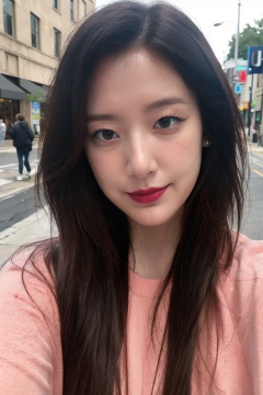 masterpiece, highest quality, extreme quality, Magenta clothes, street, upper body , babebiiie, glamour shot, seductive face,bam_15m,chutirada,aura_vadella,yeh_shaa
