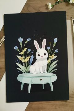 <lora:layout01_v1:1> shouzhang, layout, multimedium, no humans, still life, Iris, real flowers on desk aside paper, on the paper is a cute little cartoon rabbit picture draw in the style of watercolor sketch, chibi, <lora:watercolor_flower:0.2>, shot from side, playing with butterfly
