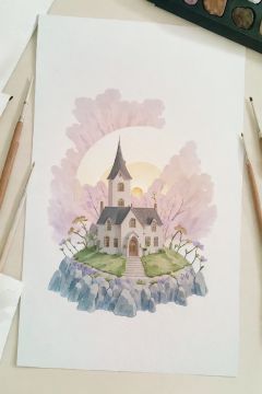 <lora:layout01_v1:1> shouzhang, layout, multimedium, no humans, still life, real flowers on desk, on the paper is the view of sunset behind a castle on the top of hill, draw in the style of watercolor sketch, cartoon, cute, lovely, <lora:watercolor_flower:0.3>,