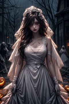 Halloween carnival night, Ghost bridal makeup, Crisp white wedding dress, Perfect for battle damage, True photography style, Bat and ghost fire, Pumpkin background, Epic picture, Face the camera, Whole body, Close-up, Realism, Super detail, 16K, HD, xinniang