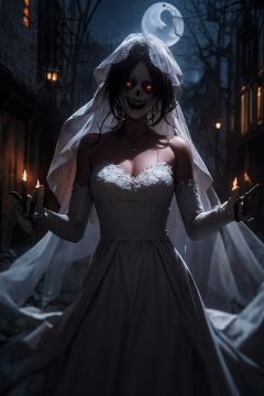 ((masterpiece)), ((best quality)), 8k, high detailed, a ghost bride, a terrifying moment, eerie atmosphere, ghastly appearance, skeleton-like figure, decomposing flesh, putrid smell, cobwebs, dim lighting, old mansion, cobblestone path, overgrown garden, decrepit walls, gnarled trees, full moon, eerie shadows, sinister grin, decaying wedding dress, tattered veil, jagged teeth, empty eye sockets, floating through the air, reaching out with bony hands, screams of terror, despair, and anguish, cold and lifeless eyes, a chilling breeze, the sound of distant howling