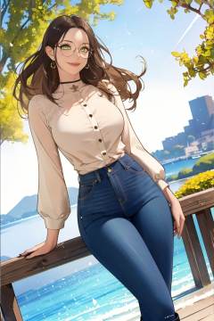 (masterpiece),(best quality),highres,incredibly absurdres,absurdres,very_high resolution,original,intricate details,hyper detail,ultra-detailed,exquisite detailed,extremely delicate,illustration,chromatic aberration,film grain,cinematic,bokeh,caustics,emphasis lines,extremely detailed CG,unity 8k wallpaper,(1girl),shiny hair,glossy hair,sharp_eyelid,eyeliner,eyelashes,eyeshadow,tall female,mature female,*******,perfect detailed face,lips,(lipgloss),feminine proportions,skinny,toned,slim,wide hips,curvy,large_breasts,perky_breasts,shiny skin,glossy skin,(long legs),cropped legs,cowboy shot,knee,(detailed beautiful scene),scenery,landscape,bloom,picturesque,UHD wallpaper,HDR,global illumination,volumetric light,wavy hair,forehead,parted bangs,lateral view,long hair,hair behind ear,brown hair,(floating hair:1.2),green eyes,smile,light smile,grin,jeans,buttons,long sleeves,white blouse,earrings,knee boots,black footwear,smartwatch,flower,sunlight,park,plant,nature,outdoors,lake,pavement,mountainous horizon,clear sky,motion blur,waves,tree,<lora:细边圆框眼镜thinRoundGlasses_v11:0.6>,(round eyewear),glasses,circle-glasses,<lora:vodor-04:0.75>,vodor,