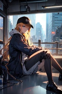 (((masterpiece))),(((best quality))),skyscraper,building,city,cityscape,hat,earrings,baseball_cap,1girl,long_hair,jacket,chain-link_fence,hood,bridge,solo,architecture,shoes,sitting,city_lights,east_asian_architecture,looking_at_viewer,neonpunkai,<lora:月影蔷薇:1>,
