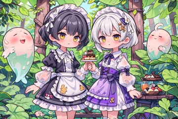 (masterpiece), 2girl, silver hair, black hair, medium hair, short hair, purple eyes, yellow eyes, medium breasts, white shirt, translucent, short black skirt, lace, frills, lace trims, frilled sleeves, frilled skirt, lolita fashion, maid, sweets, cookie, candy, swirl lollipop, chocolate, candy cane, (ghost), monster, swamp, jungle, cooking