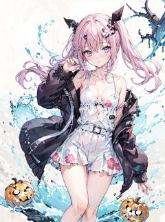 (databook:1.4), (concept art:1.2),hand in pocket,(double v:1.2),halloween costume,pumpkin,skull on head,tombstone,genie,star hair ornament,flame,+++++masterpiece,loli,(petite:1.2),high ponytail,medium breast,(panorama:1.2),caustics,best quality,beautiful detailed eyes,(pink hair),wavy hair,disheveled hair, messy hair, long bangs, hairs between eyes, extremely detailed, floating hair,solo, best quality, masterpiece, highres, original, extremely detailed wallpaper,{an extremely delicate and beautiful}++++loose clothes,(white t-shirt:1.4),(black open jacket:1.2),++hairclip+/*/*/*++(floral print:1.2)+/*/*/*+++blue eyes, {beautiful eyes},solo,