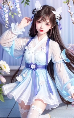 hanfu,1girl, solo, dress, long hair, butterfly, brown hair, thighhighs, bug, flower, hair ornament, looking at viewer, white dress, bangs, white thighhighs, long sleeves, parted lips, butterfly hair ornament, wisteria, red lips, petals, blunt bangs, 1girl, cuteloli,8k