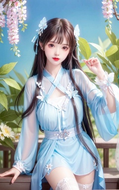 huge breast,huge breast:1.5,huge breast:1.5, hanfu,1girl, solo, dress, long hair, butterfly, brown hair, thighhighs, bug, flower, hair ornament, looking at viewer, white dress, bangs, white thighhighs, long sleeves, parted lips, butterfly hair ornament, wisteria, red lips, petals, blunt bangs, 1girl, cuteloli