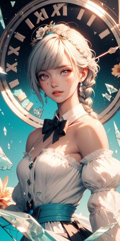 (((masterpiece))),best light,extremely detailed CG,(broken glass:1.5),(blue theme),sparkle,lens flare,light leaks,(illustration:1.2),(low saturation:1.4),(low contrast:1.4),(contrast colour:1.2),1girl,(detailed Glass hair:1.3),Gem body,/////,crystalline purple gemstone gloves,(long white hair:1.3),(mini top hat),detailed red eyes,hair between eyes,braid,french braid,disheveled hair,ankle lace-up,off-shoulder dress,big top sleeves,floating,beautiful detailed gemstone sky,gemstone sea,beautiful detailed eyes,overexposure,side blunt bangs,hairs between eyes,ribbons,bowties,buttons,bare shoulders,(((small breast))),pleated skirt,crystals texture flowers,(magic circle:0.9)/=(clock:1.35),finely detail,Depth of field,Blood drop,Blood fog,