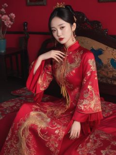best quality,highly detailed,<lora:xiuhe2-000006:0.5>,a woman in a red and gold clothes, phoenix coronet,(sitting on red bed),blush,shy,black_hair, looking down, earrings, indoors, jewelry, long_sleeves, red lips, tassel, Red quilt,(red palace:1.2), <lora:zgirlxl8-000020:0.5>zgirl,