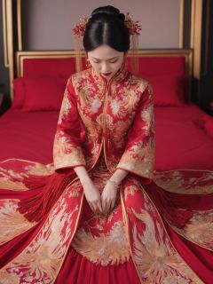 best quality,highly detailed,<lora:xiuhe2-000006:0.5>,a woman in a red and gold clothes, phoenix coronet,(sitting on red bed),blush,shy,black_hair, looking down, earrings, indoors, jewelry, long_sleeves, red lips, tassel, Red quilt,(red palace:1.2), <lora:zgirlxl8-000020:0.3>zgirl,