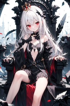 (((masterpiece))), best quality, illustration, (white hair, red eyes), a girl, solo, bare shoulders, flat chest, white hair, red eyes, very long white hair, floating black feathers, wavy hair, black and white sleeves, gold and silver fringes, a blackhole behind the girl, a silver triple crown inlaid with obsidian, (sitting) on the black ((throne)), (depth) of (field).