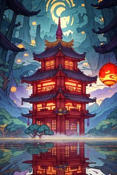 A surrealistic depiction of the mythical city of Fengdu. The city stands tall, engulfed in ethereal mist, with towering ancient buildings adorned in intricate carvings. The skyline is dotted with elaborate temples and pagodas that seem to blend seamlessly with the surrounding mountains. The city is surrounded by a tranquil river, its calm waters reflecting the otherworldly beauty of Fengdu. The color palette is rich and vibrant, with deep blues, purples, and golds dominating the scene. The lighting is soft and dreamlike, casting a warm glow over the city. The overall atmosphere is mysterious and mystical, evoking a sense of wonder and enchantment.