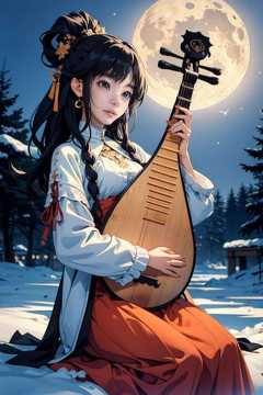 1girl, (playing_pipa, holding pipa), moon, black hair,  snow,  masterpiece, best quality, 8k,  close up,  <lora:pipa_v1a:0.73>, sitting