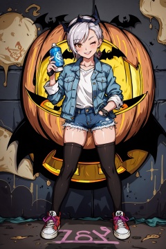 best quality,masterpiece,illustration,earrings,bodypaint,hand in pocket,Denim shorts,(black silk stockings),smile,(one eye closed),an extremely delicate and beautiful,extremely detailed,CG,unity,8k,wallpaper,Amazing,finely detail,1 girl, solo, street, graffiti,white shirt, denim jacket, denim shorts, sneakers,(spray painting),(graffiti on the wall),(graffiti), hip-hop, street culture, Halloween, jack-o'-lantern, bat, bat, Tombstone, Best quality, 8k