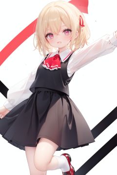 1girl, rumia, blonde hair, solo, white background, red eyes, red footwear, simple background, ascot, short hair, ribbon, open mouth, hair ribbon, smile, long sleeves, shirt, looking at viewer, red ascot, white socks, white shirt, red ribbon, shoes, socks, frills, bangs, outstretched arms, hair between eyes, skirt, :d, dress, vest, mary janes, black dress, black skirt, collared shirt, black vest, blush