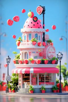 3dfz, no humans, sign, food, scenery, plant, window, outdoors, building, sky, heart, shop, blue sky, day, lamppost, stairs, fruit, potted plant, english text,tilt-shift,best quality,masterpiece,realistic,HDR,UHD,8K,