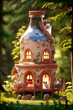 3dfz, no humans, mouse, house, chimney, window, plant, grass, rabbit, outdoors, tree, blurry, vines, bottle, animal,tilt-shift,best quality,masterpiece,realistic,HDR,UHD,8K,