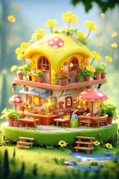 3dfz, no humans, flower, grass, ladder, window, plant, scenery, book, mushroom, yellow flower, water, watering can, blurry, potted plant, outdoors,tilt-shift,best quality,masterpiece,realistic,HDR,UHD,8K,