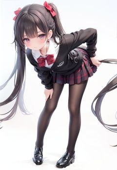 1girl, solo, pantyhose, skirt, long hair, loafers, shoes, simple background, school uniform, brown eyes, plaid, black pantyhose, plaid skirt, looking at viewer, black hair, pantyhose pull, full body, clothes pull, black footwear, pleated skirt, leaning forward, bangs, long sleeves, bent over, cardigan, bow, bowtie, standing, closed mouth, pulled by self, grey background, blush, miniskirt, red bow, sweater, **********