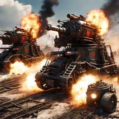 <lora:DieselPunkAI:.8> Multiple DieselPunkAI mechanized artillery , fighting,  warfare, extreme, action, destruction, cinematic, hyperrealistic, masterpiece, detailed
