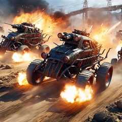 <lora:DieselPunkAI:.8> Multiple DieselPunkAI mechanized battle buggies racing , fighting,  warfare, extreme, action, destruction, cinematic, hyperrealistic, masterpiece, detailed