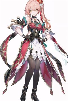 8k, best quality, masterpiece, (ultra-detailed:1.1), (high detailed skin),(full body:1.2), white background, standing, looking at viewer, solo, hand on hip,<lora:gnf-v100-000027:0.85:lbw=OUTALL>, gnf, long hair, dress, side ponytail, hair ornament, black gloves, pantyhose, black footwear, yellow eyes, breasts, hair flower, (white background, simple background,:1.2),<lora:EnvyBetterHands LoCon_beta2 辅助:0.55>, ( good hands, nice hands:0.5),(beautiful_face), ((intricate_detail)), clear face,((finely_detailed)), fine_fabric_emphasis,((glossy)), full_shot,