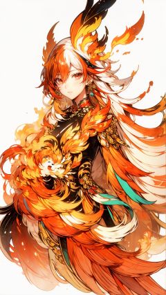 [(white background:1.4)::4], solo, (traditional media:1.3), round image, solo,outline,,simple background, white_hair, orange_eyes, streaked_hair, fu hua, orange_hair, red_hair, fire, fiery_hair, hair_between_eyes, multicolored_hair, fu hua\bengluo, fiery_wings