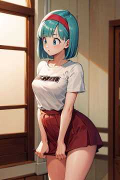 masterpiece, best quality, highres, dragon ball, blmmid, aqua hair, medium hair, blunt bangs, red hairband, medium breasts, shirt, skirt, <lora:bulma_v1:0.7>, cowboy shot, indoors, standing,