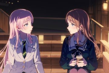 masterpiece, best quality, PIXIV,aisu,2girls, long hair, brown hair, school uniform, necktie, blue eyes, looking at another, sitting, holding, jacket, pink hair, green necktie, long sleeves, blazer, grey eyes, serafuku, cup,night <lora:aisu-000018:1>