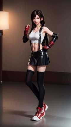 1girl,tifa lockhart,solo,thighhighs,skirt,suspenders,long hair,crop top,gloves,red footwear,suspender skirt,black thighhighs,fingerless gloves,full body,**** top,black skirt,midriff,navel,elbow gloves,boots,black hair,white **** top,clenched hands,brown eyes,fighting stance,brown hair,<lora:MIAOKA_tifa:0.8>,full body,red eyes,arena,