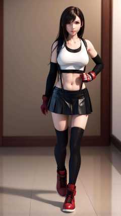best quality,masterpiece,realistic,3D graphics,1girl,tifa lockhart,solo,thighhighs,skirt,suspenders,long hair,crop top,gloves,red footwear,suspender skirt,black thighhighs,fingerless gloves,full body,**** top,black skirt,midriff,navel,elbow gloves,boots,black hair,white **** top,clenched hands,brown eyes,brown hair,full body,red eyes,<lora:MIAOKA_tifa:0.8>,heart tail duo,
